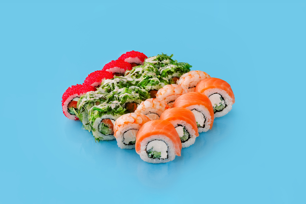 8шт. Филадельфия с огурцом 8шт. Ролл с огурцом 8шт. Жареный лосось с крабом и унаги соусом 8шт. Запеченный с курицей 3шт. Соевого соуса 2шт. Имбиря 2шт. Васаби