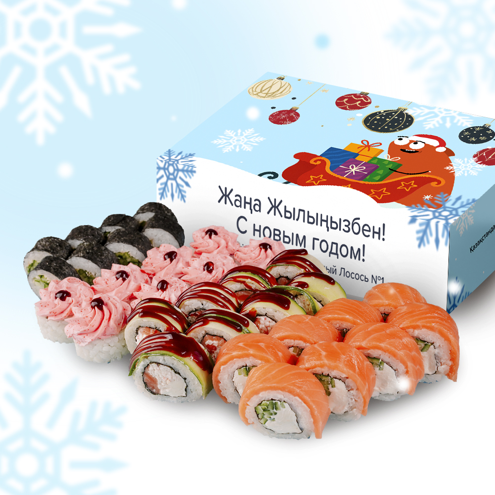 Новогодняя упаковка Филадельфия с огурцом 8шт Гринч ролл с лососем и крабом 8шт Лава ролл с креветкой 8шт Ролл с огурцом 8 шт 3 соевых соуса 2 имбиря 2 васаби