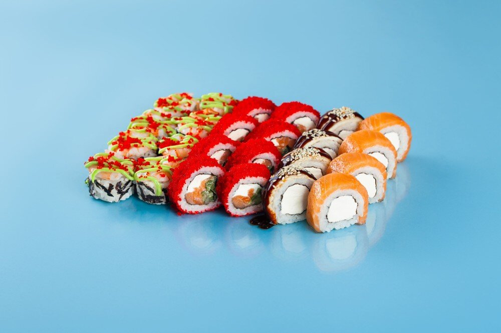 Филадельфия классик 4шт, Дракон классик 4шт, Калифорния c лососем 8шт, Ролл с креветкой и васаби (острый) 8шт, 2 соевых соуса, 1 васаби, 1 имбирь
