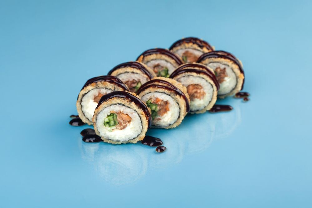 Рис, нори, сливочный сыр, огурец, жареный норвежский лосось, унаги соус, кляр, сухари Kaneshiro Premium 1 порц= 8шт
