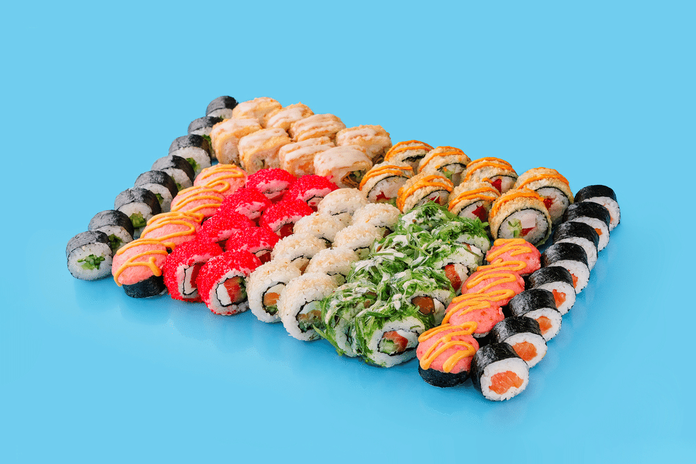 Запеченный с лососем и яки шапкой 8 шт, Жареный цыпленок спайси (острый) 8шт, Жареный снежный краб с тортильей 8шт,Чука ролл с лоосем 8шт, Ролл с лососем 8шт, Ролл с огурцом 8шт, Калифорния с лососем 8шт, Аляска с лососем 8шт, 5 соевых соусов, 3 васаби, 3 имбиря