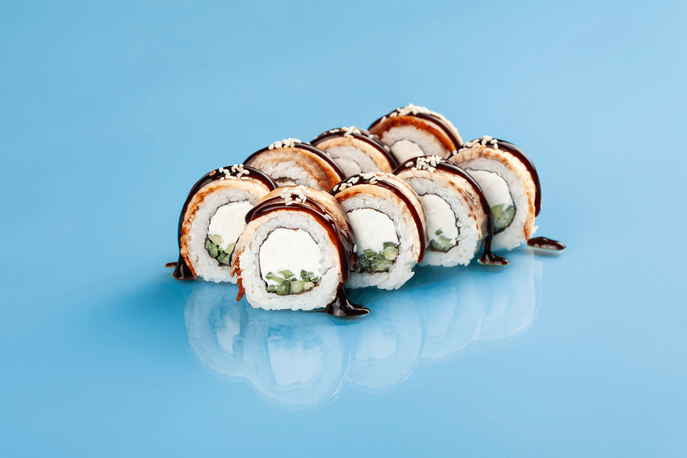 Рис, нори, сливочный сыр, огурец, угорь, кунжут, унаги соус *Рыба может содержать небольшие фрагменты костей
