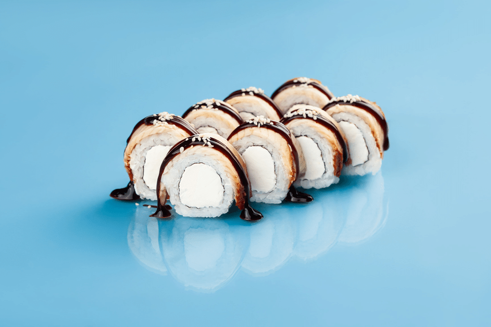 Рис, нори, сливочный сыр, угорь, кунжут, унаги соус *Рыба может содержать небольшие фрагменты костей