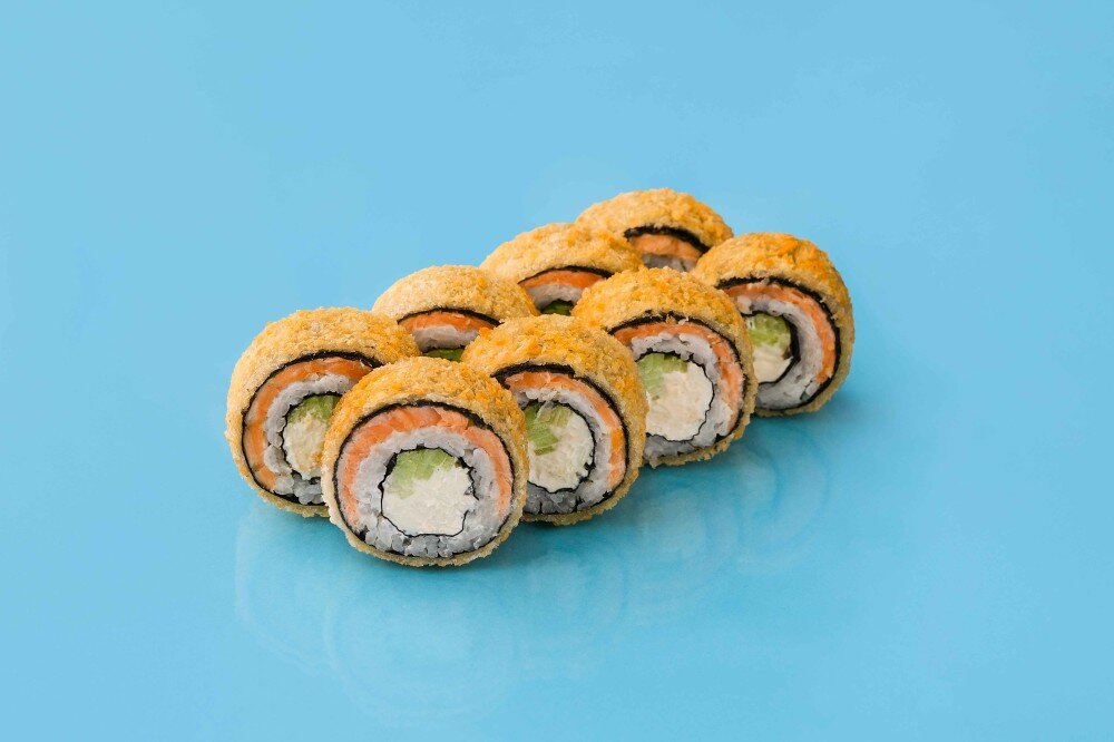 Рис, сыр творожный, огурцы, нори, лосось, сухари, кляр.
