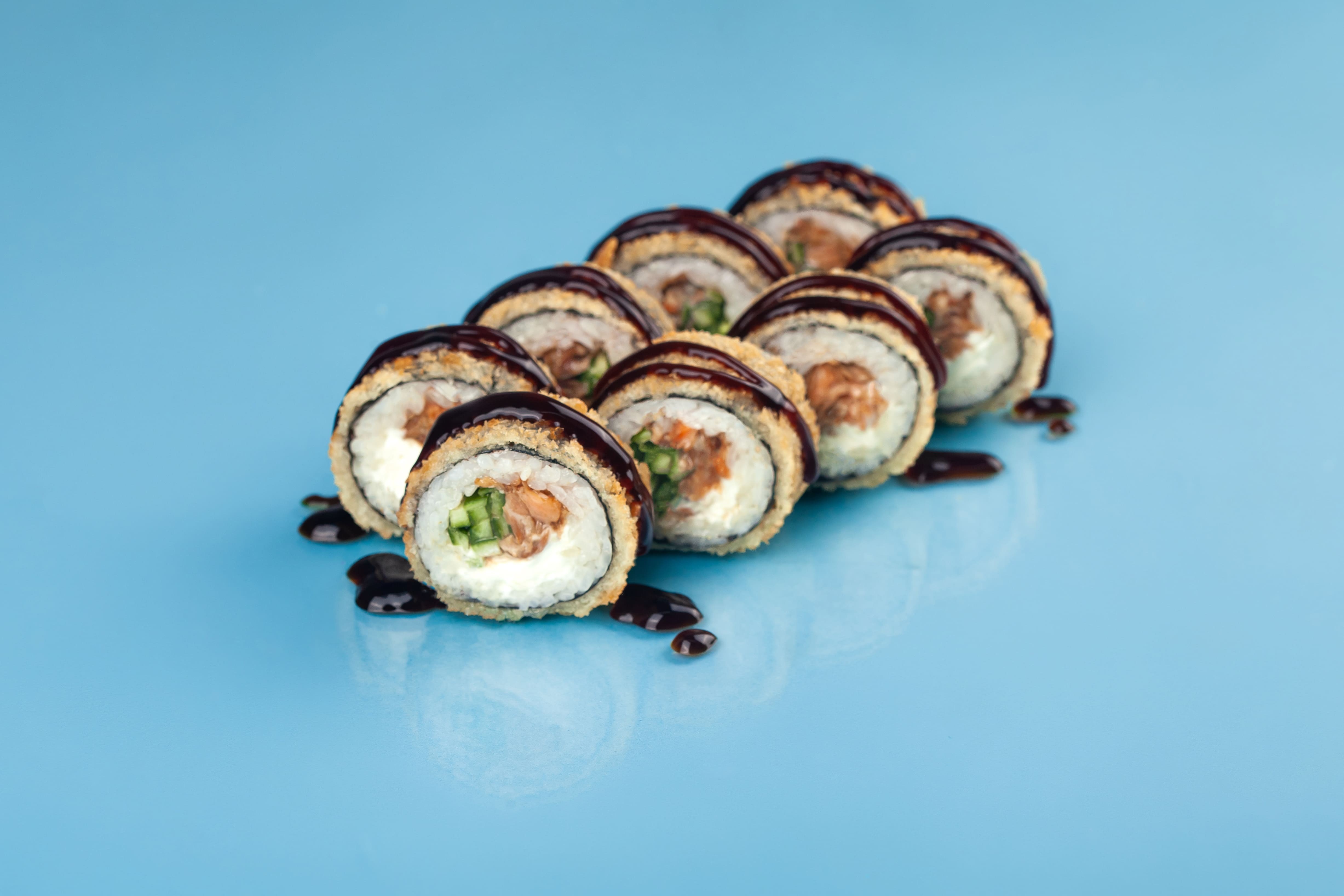 Рис, нори, сливочный сыр, огурец, жареный норвежский лосось, унаги соус, кляр, сухари Kaneshiro Premium