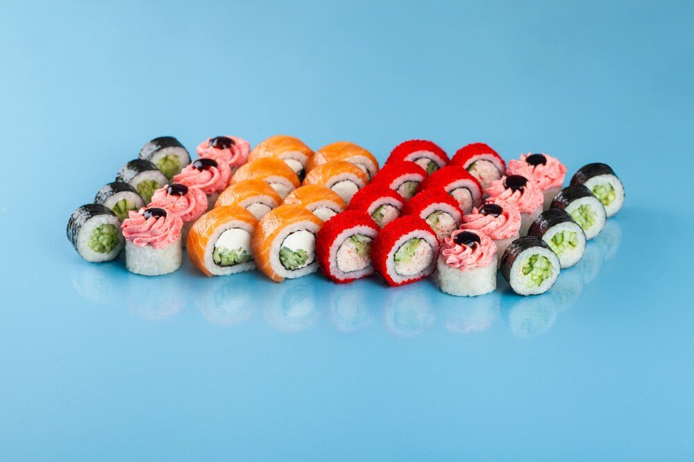 Филадельфия с огурцом 8шт, Лава ролл с лососем 8шт, Ролл с огурцом 8шт, 8 шт, Калифорния снежный краб 8шт, 2 соевых соуса, 1 васаби, 1 имбирь