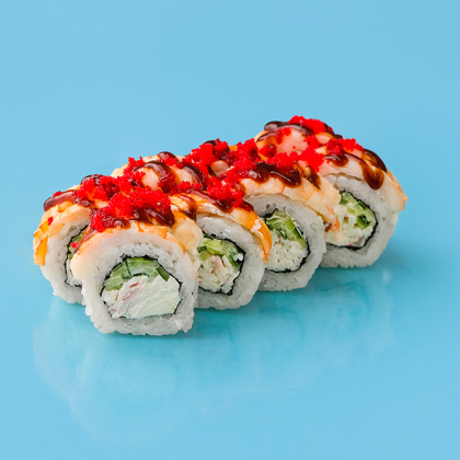 Рис, нори, сыр творожный, креветки темпура, авокадо, угорь, соус унаги, кунжут *Угорь может содержать фрагменты костей