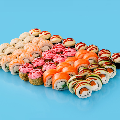 8шт. Филадельфия с огурцом 8шт. Филадельфия с креветкой 8шт. Грин ролл с лососем 8шт. Аляска с лососем 8шт. Жареный лава с лососем 4шт. Соевых соусов 2шт. Имбиря 2шт. Васаби