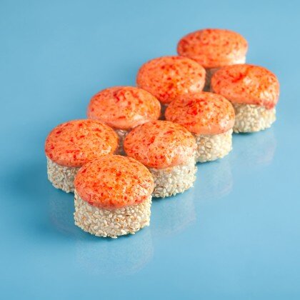 Основа: Японский рис с заправкой Морские водросли нори Начинка: Жареный лосось в соусе унаги Зеленый лук Свежий огурец Шапочка: Спайси соус (острый) Яки шапка
