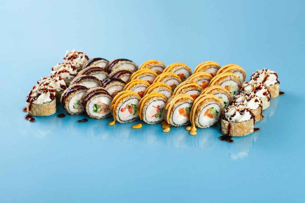 Жареный цыпленок спайси (острый) 8 шт, Жареный с угрем и сыром 8шт, Жареный с лососем унаги 8шт, Жареный с лососем спайси (острый) 8шт, 3 соевых соуса, 2 имбиря, 2 васаби