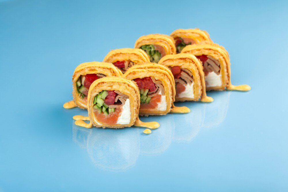 Тортилья, сливочный сыр, норвежский лосось, помидоры, огурец, тамаго блинчик, кляр, сухари Kaneshiro Premium, соус спайси 1 порц= 8шт