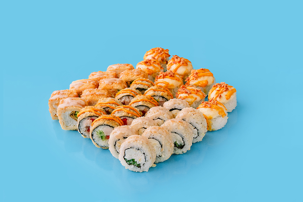 8шт. Аляска снежный краб 8шт. Запеченный цыпленок криспи с соусом спайси 8шт. Жареный снежный краб с тортильей 8шт. Жареный цыпленок спайси 3шт. Соевого соуса 2шт. Имбиря 2шт. Васаби