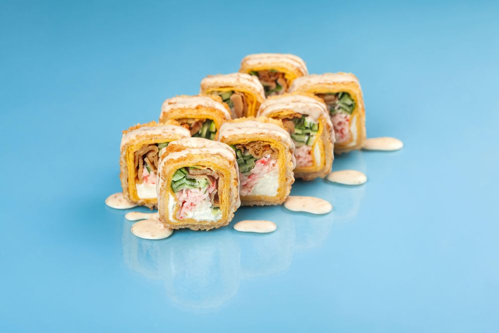 Тортилья, сливочный сыр, снежный краб, огурец, тамаго блинчик, кляр, сухари Kaneshiro Premium, ореховый соус