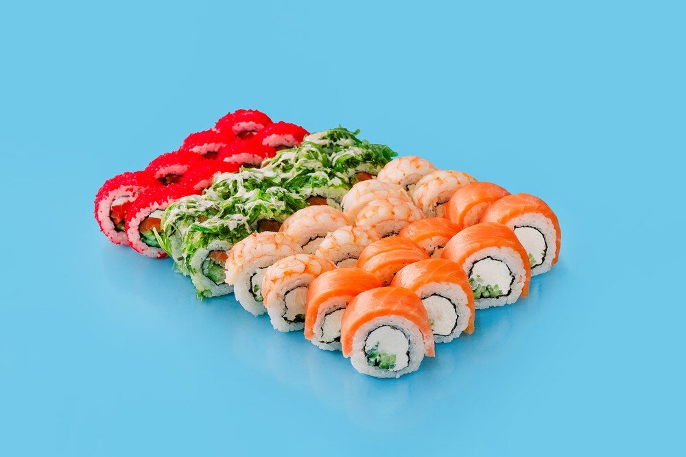 Филадельфия с огурцом 8шт, Калифорния с лососем 8шт, Филадельфия с креветкой 8шт, Чука ролл с лоосем 8шт, 3 соевых соуса, 2 васаби, 2 имбиря