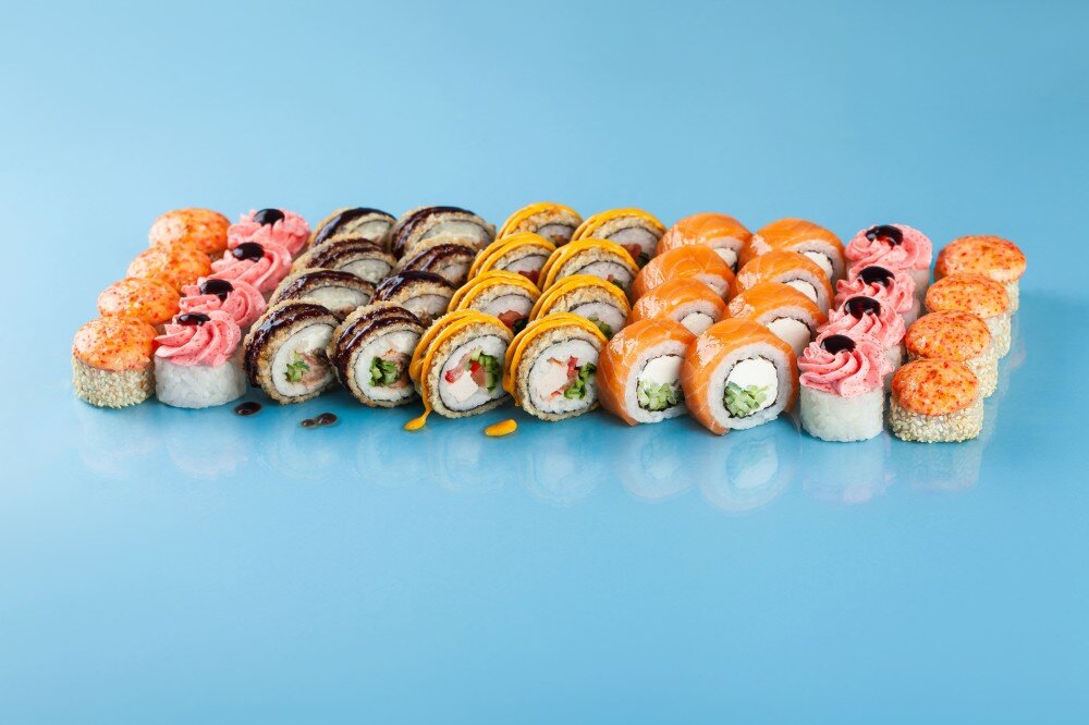 Филадельфия с огурцом 8шт, Жареный с лососем унаги 8шт,Запеченный с лососем яки и слив сыром 8шт, Лава ролл с креветкой 8шт,Жареный цыпленок спайси (острый) 8шт, 4 соевых соуса, 2 васаби. 2 имбиря