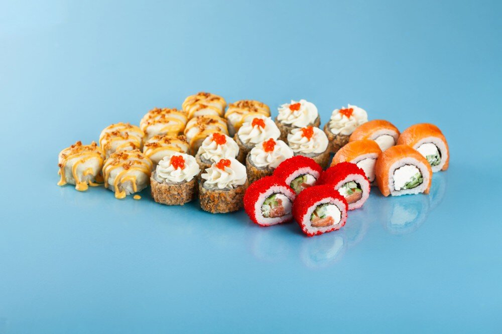 Филадельфия с огурцом 4 шт, Калифорния с лососем 4 шт, Запеченный цыпленок криспи с соусом спайси (острый) 8шт, Жареный с креветкой и сыром 8 шт, 2 соевых соуса, 1 васаби, 1 имбирь