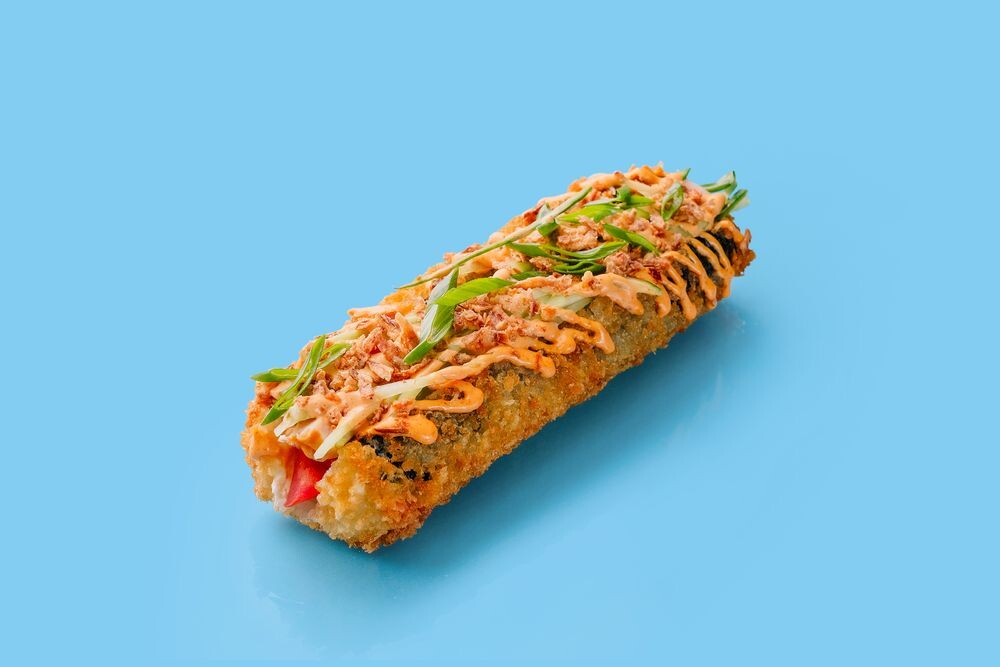 Основа: Японский рис с заправкой Морские водоросли нори Сухари панко Начинка: Копченая курица Кремчиз Свежий огурец Помидор Оформление: Соус спайси (острый) Зеленый лук Жареный лук криспи