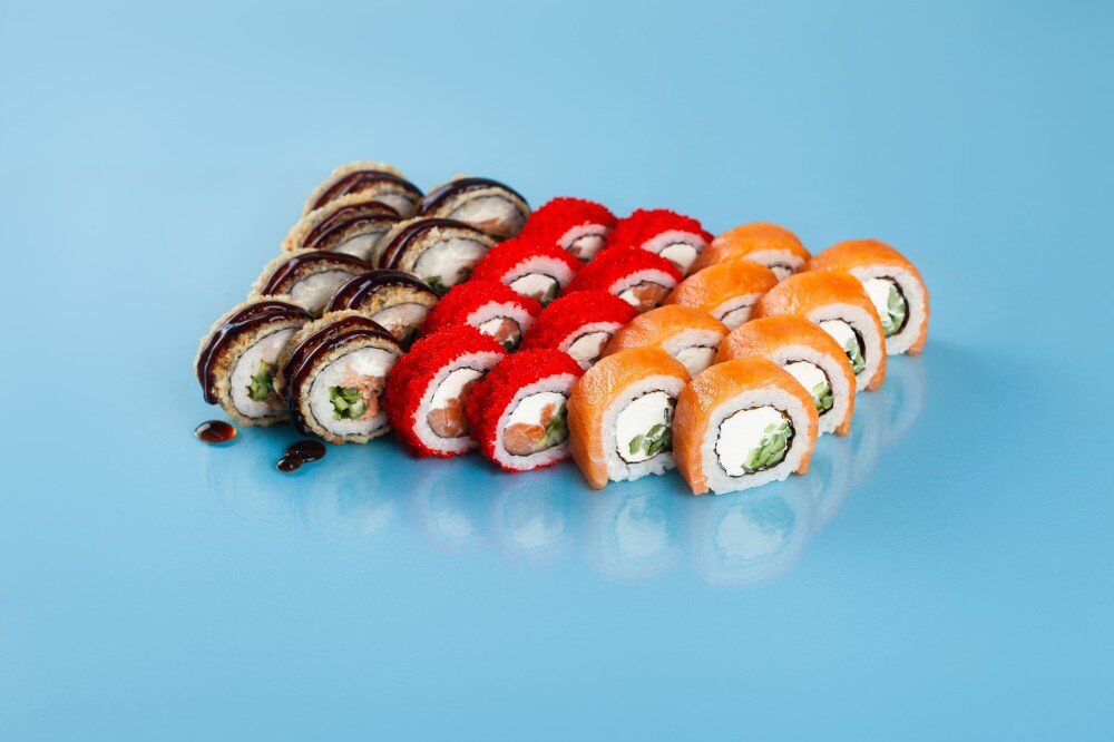 Филадельфия с огурцом 8шт, Жареный с лососем унаги 8шт, Калифорния с лососем 8шт 2 соевых соуса, 1 васаби, 1 имбирь