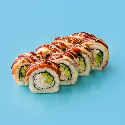 Рис, нори, сыр творожный, креветки темпура, авокадо, угорь, соус унаги, кунжут *Угорь может содержать фрагменты костей