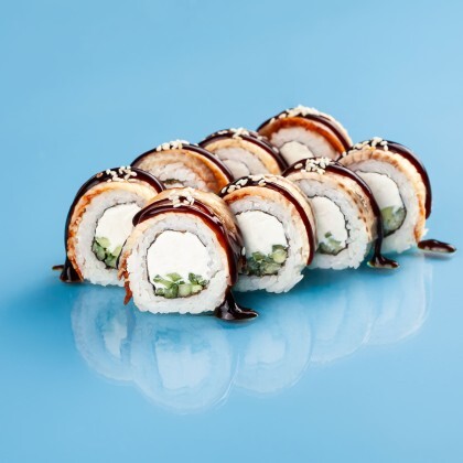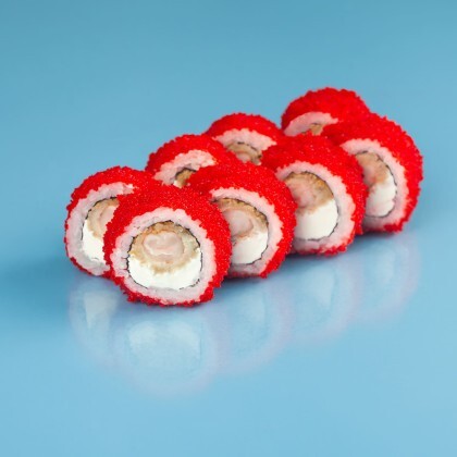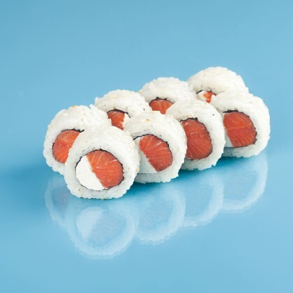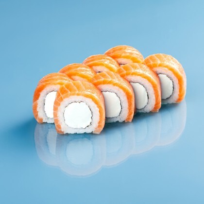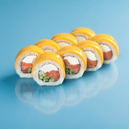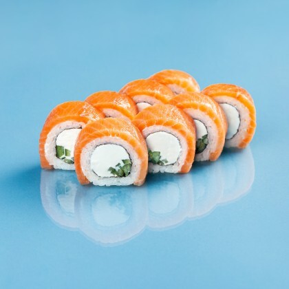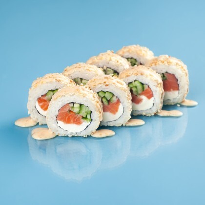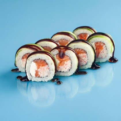 Рис SHINAKI, нори, сливочный сыр, норвежский лосось, огурец, водоросли чука, ореховый соус