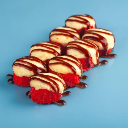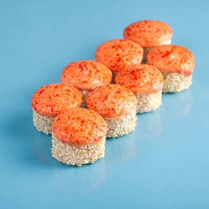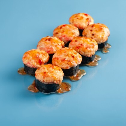 Рис SHINAKI, нори, сливочный сыр, жареный норвежский лосось в унаги соусе, тамаго блинчик, сырная шапка, унаги соус. 1 порц= 8шт *В составе шапочки присутствует молотый чеснок