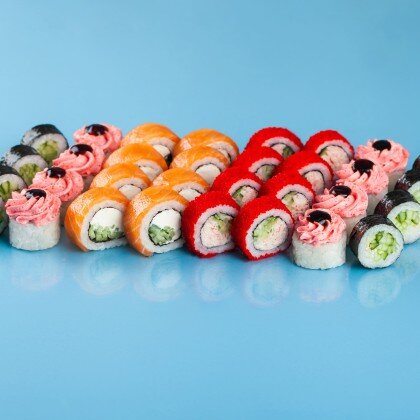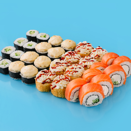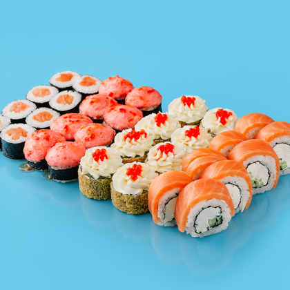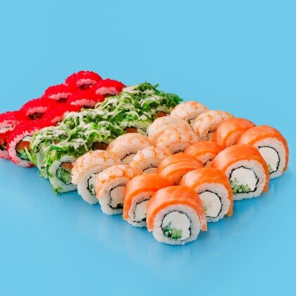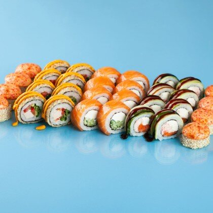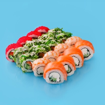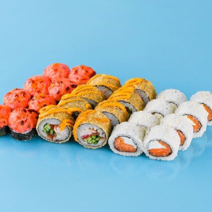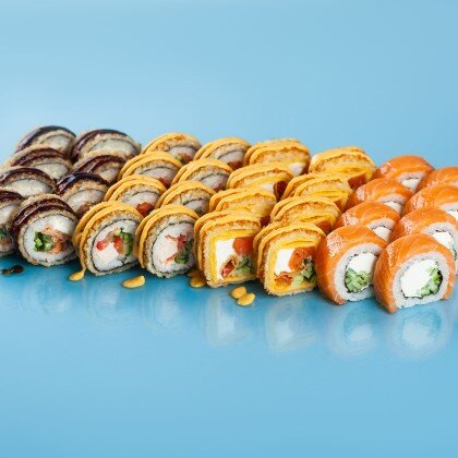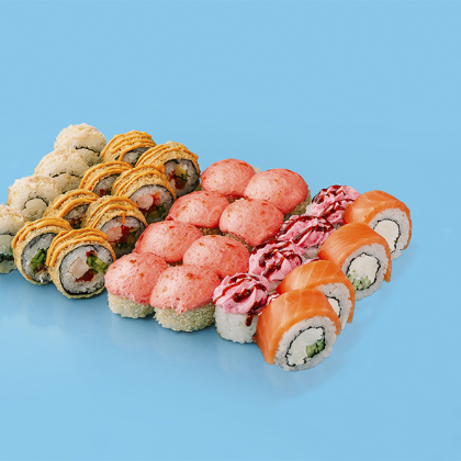 Жареный цыпленок спайси (острый) 8 шт, Жареный с угрем и сыром 8шт, Жареный с лососем унаги 8шт, Жареный с лососем спайси (острый) 8шт, 3 соевых соуса, 2 имбиря, 2 васаби