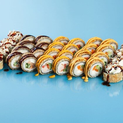 8шт. Аляска снежный краб 8шт. Запеченный цыпленок криспи с соусом спайси 8шт. Жареный снежный краб с тортильей 8шт. Жареный цыпленок спайси 3шт. Соевого соуса 2шт. Имбиря 2шт. Васаби
