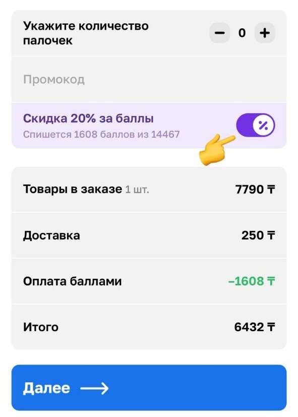 • Чтобы оплатить часть заказа бонусами, нажмите в корзине на значок "%" рядом с текстом скидка ХХ% за баллы.