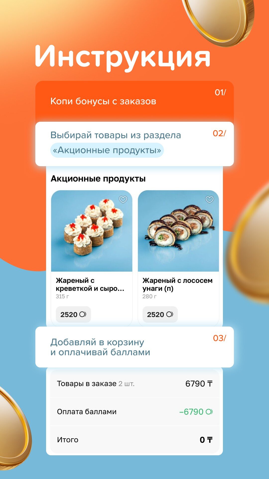 • Бонусами можно оплатить 100% стоимости любого товара из раздела «Блюда за баллы».